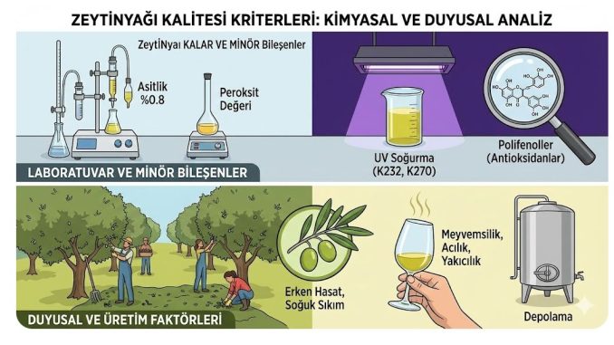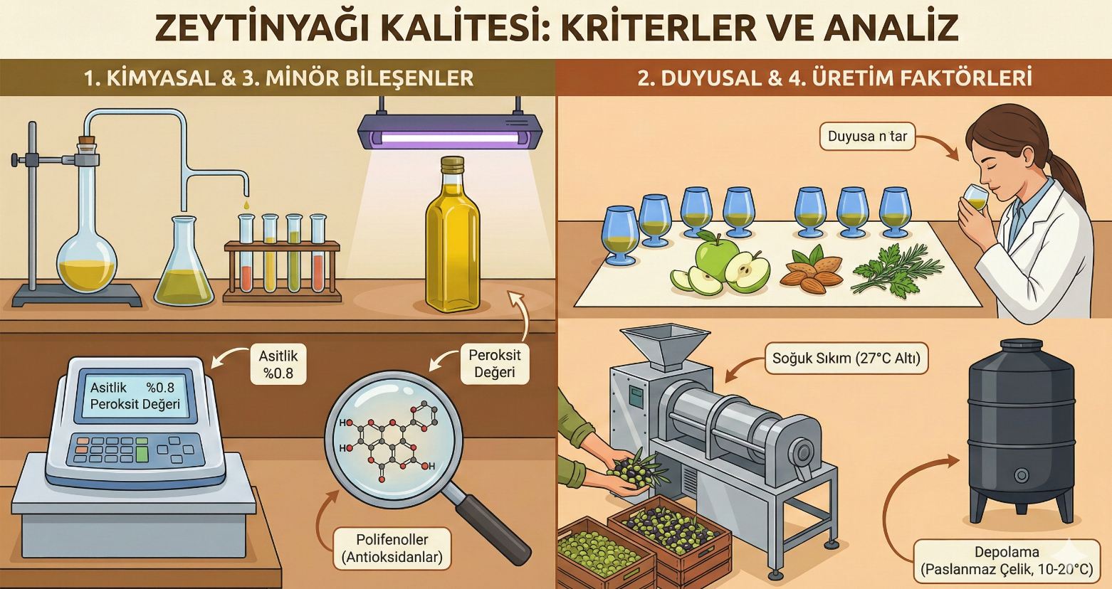 Hülasa; zeytinyağının vasfını anlamak için asidite ve peroksit gibi kimyevi değerlerin düşük, fenolik bileşenlerin yüksek olması; duyusal açıdan ise meyvemsi, acı ve yakıcı özelliklerin hissedilmesi, buna mukabil küf, sirke veya bayatlama gibi fena kokuların (kusurların) bulunmaması lazımdır.